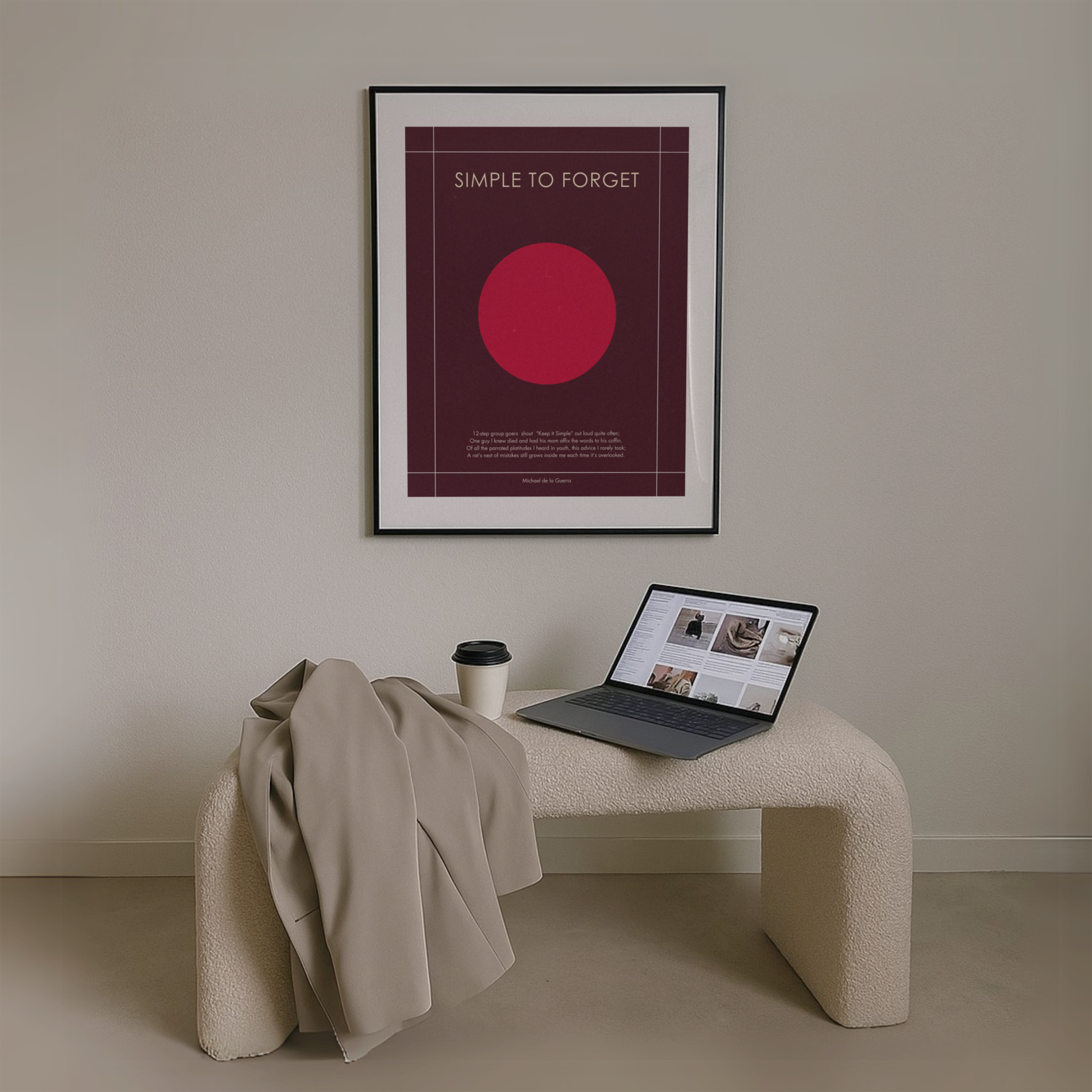 “Simple to Forget” reflects on the trite slogans passed around in recovery and life, and how they fail the weight of real loss. The poster puts the poem’s bitter humor center stage; the art underscores the uneasy tenderness beneath.